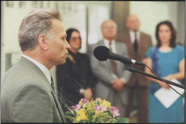 Opening ceremony of exhibit at M. Mazvydo National Library of Lithuania (1997) with organizers,